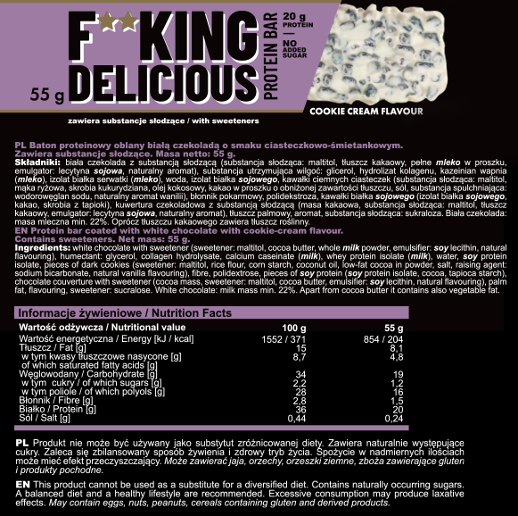 Fitking Delicious Protein Bar is a sweet snack suited for any time of day, which perfectly supplements deficiency of high-quality protein that occurs in case of increased demand, especially in competitive sports and bodybuilding. Now there are even more ways to provide yourself with the right amount of protein throughout the day. F**king Delicious Protein Bar – a snack you can spoil yourself with!